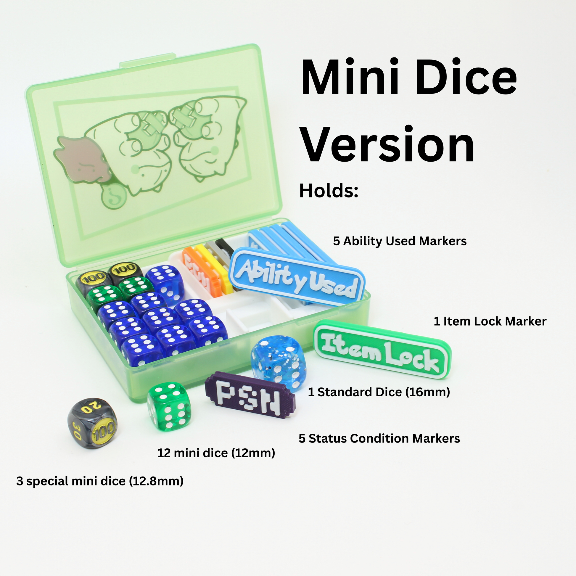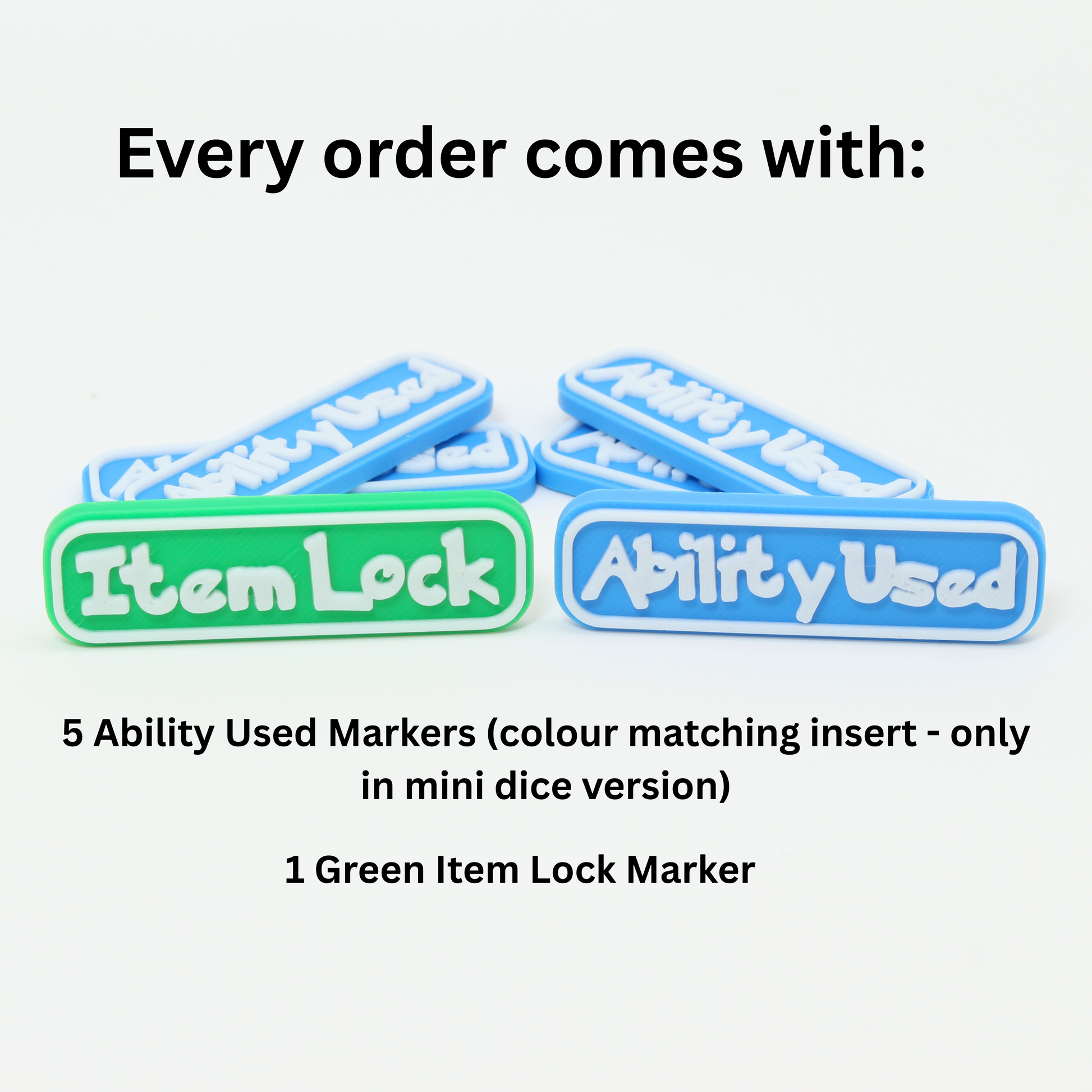 • 5 Ability Used Markers (matching insert colour - when purchasing mini dice version)