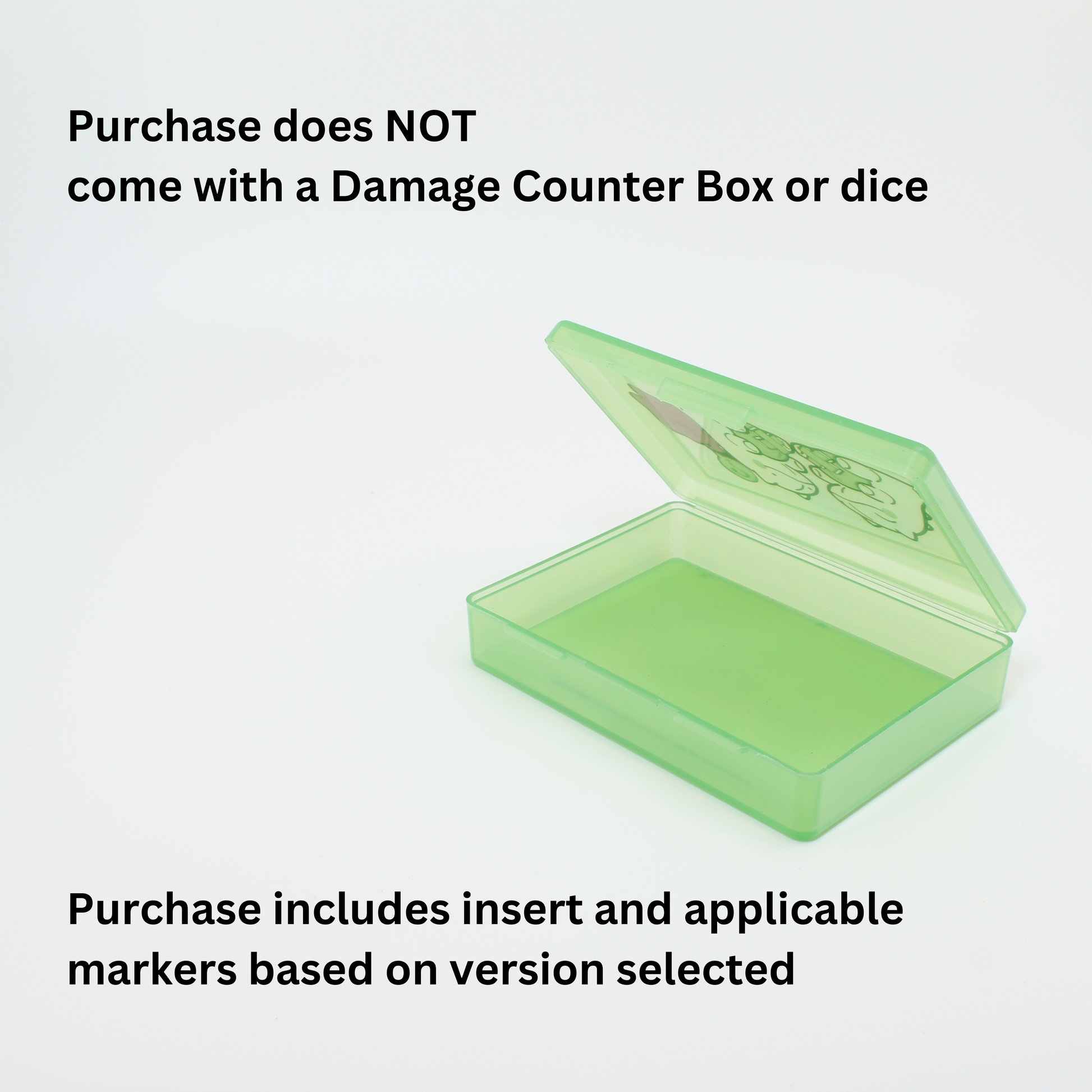 The damage counter box and dice, and dice are NOT included. These are shown for demonstration purposes only.